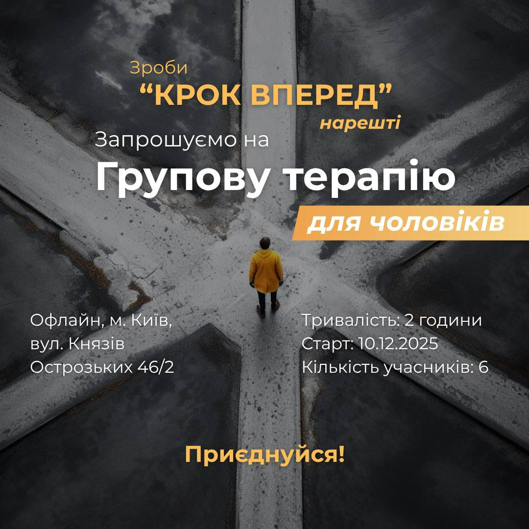 Групова терапія - це простір взаємної підтримки, де ви бачите себе через інших, вчитеся будувати стосунки та проживати складні переживання в безпеці спільноти. Група дає відчутний потенціал, який кожний учасник може використати для змін в реальному житті.