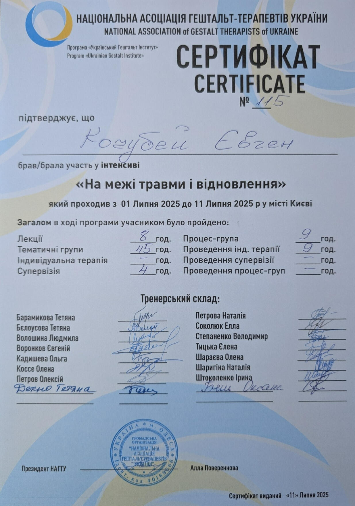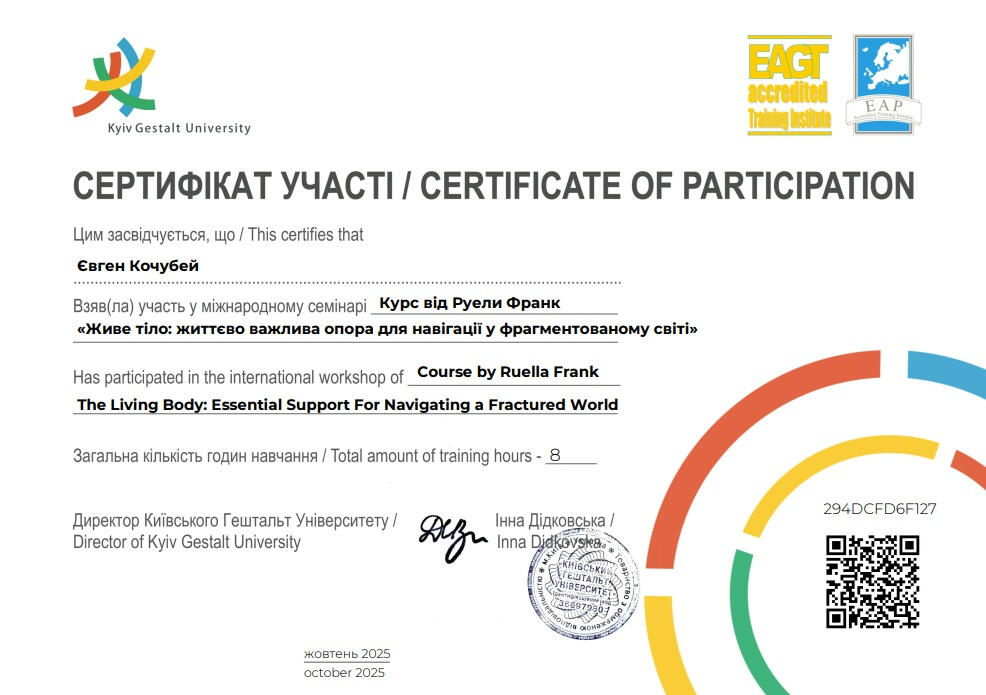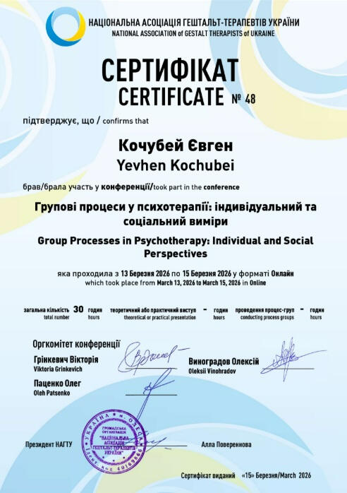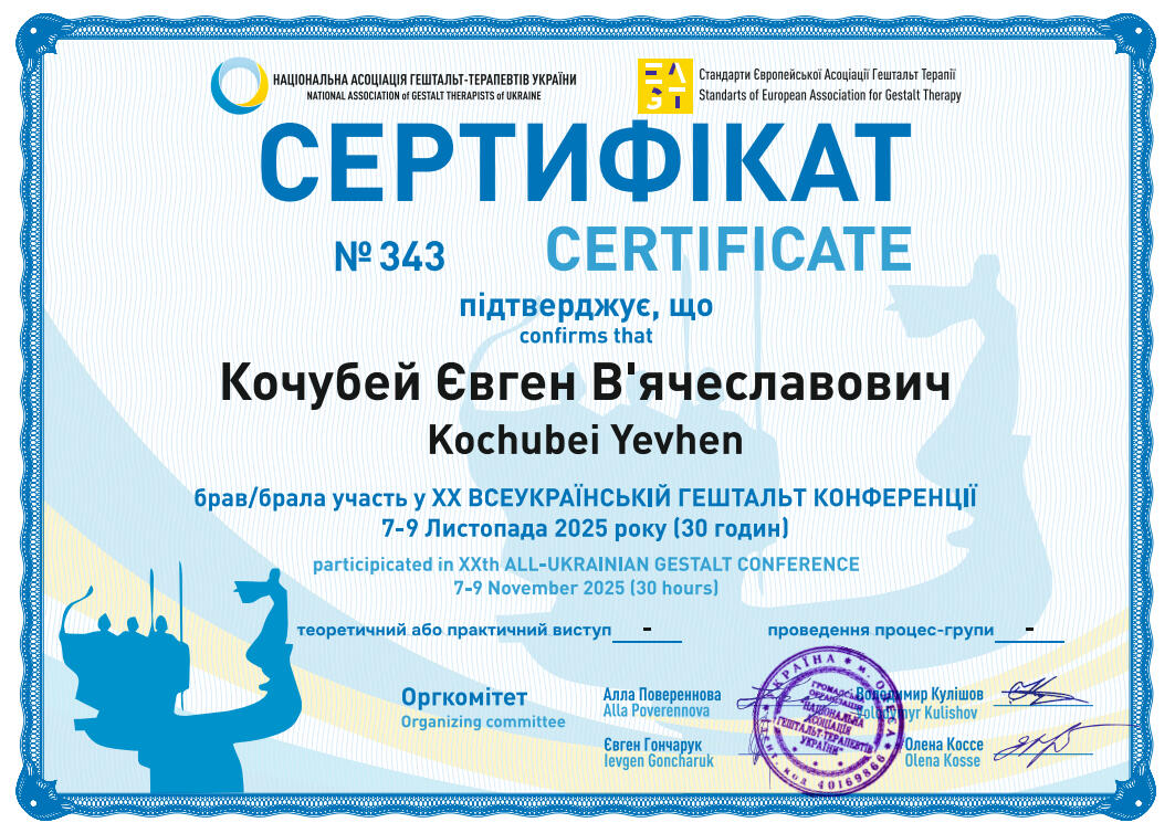Я - дипломований клінічний психолог, завершую навчання на гештальт-терапевта (2-й ступінь програми НАГТУ, сертифікація в травні 2026), коуч і ведучий тренінгів. У своїй практиці працюю під регулярною індивідуальною супервізією, відвіую супервізійні групи, маю постійну особисту терапію, що забезпечує якість моєї роботи. Я є членом Національної асоціації гештальт-терапевтів України (НАГТУ) і дотримуюсь етичного кодексу цієї організації.