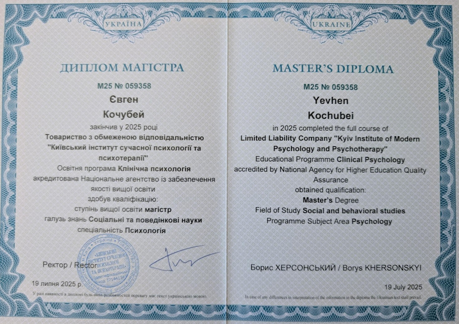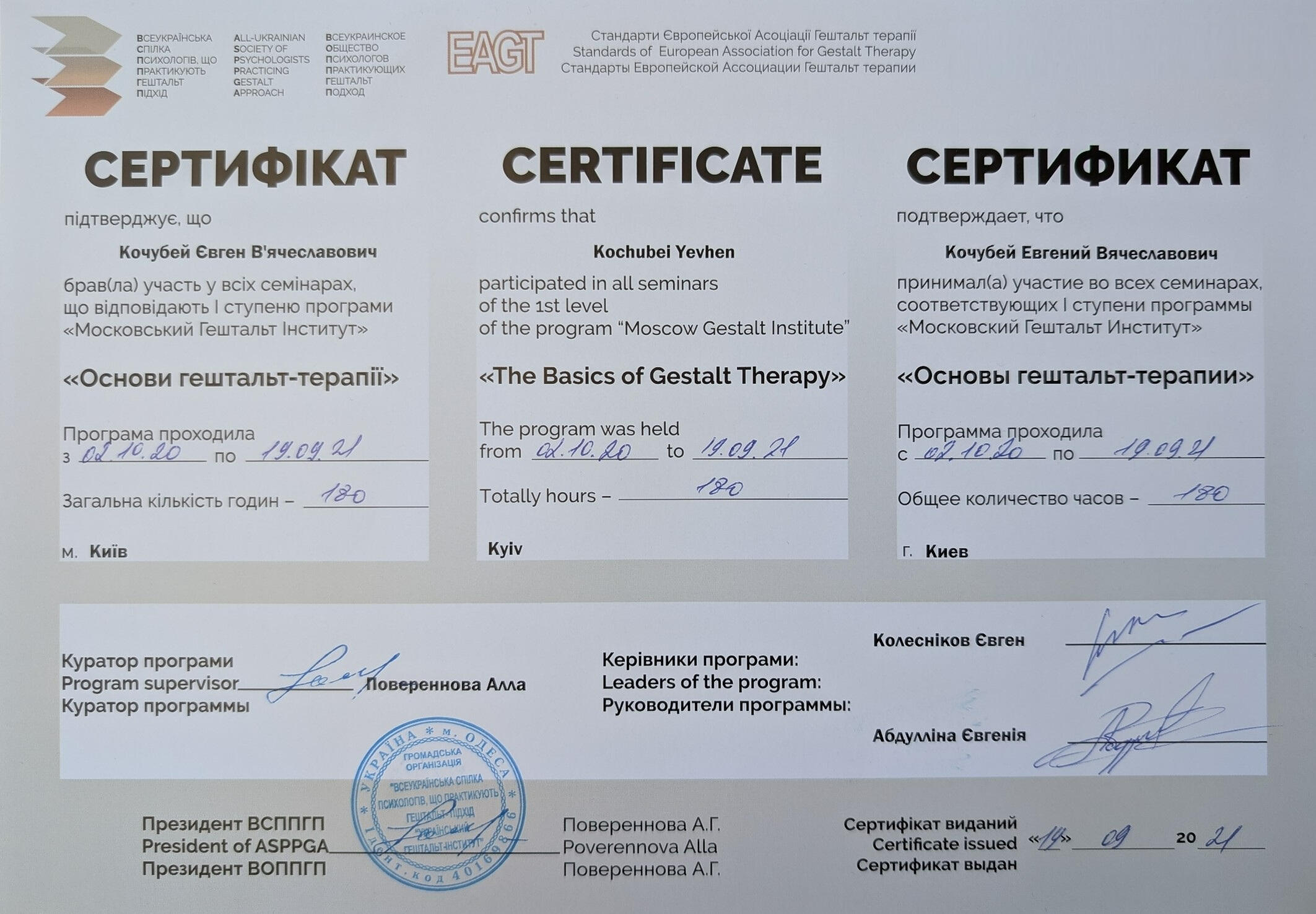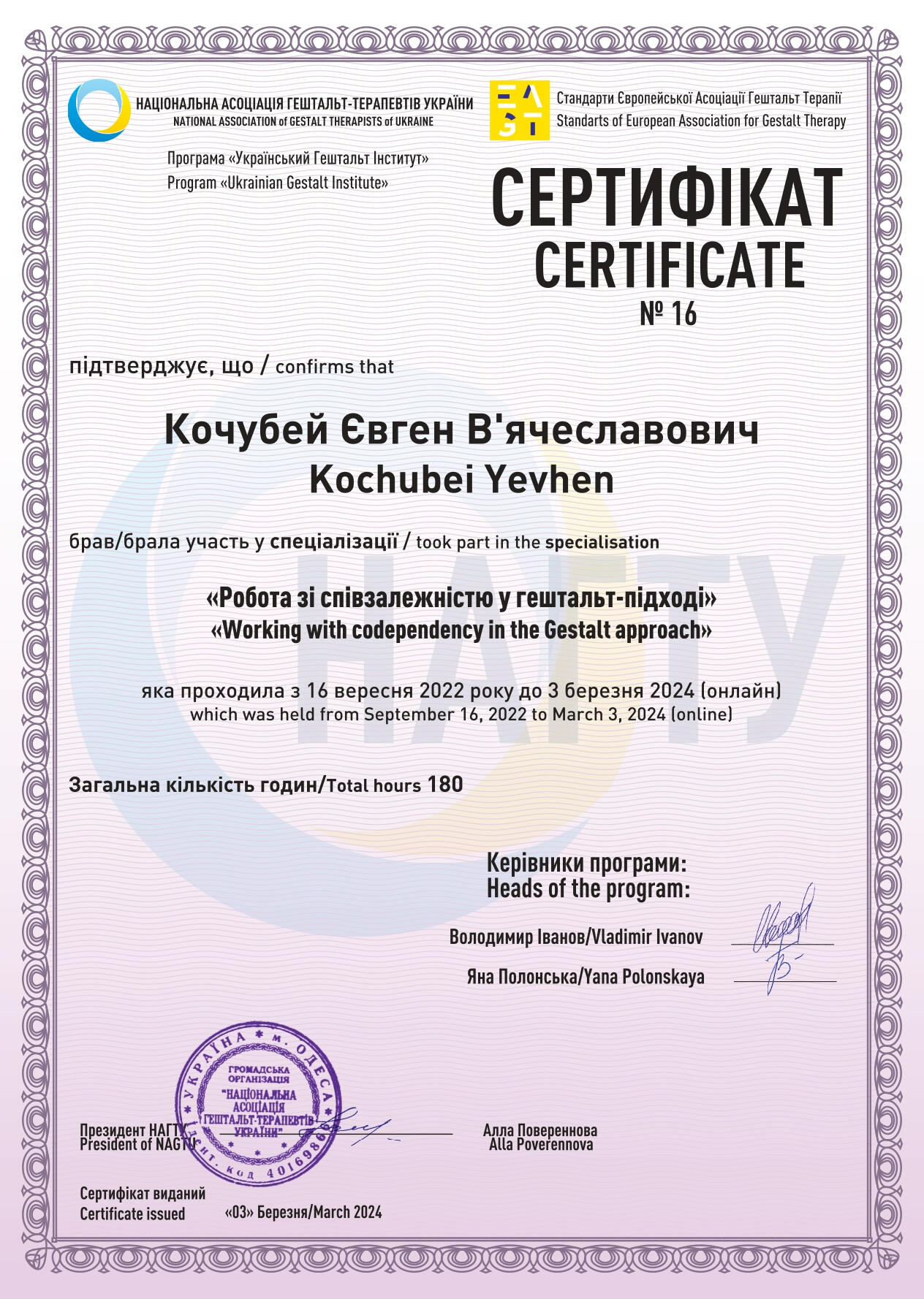 Я - дипломований клінічний психолог, завершую навчання на гештальт-терапевта (2-й ступінь програми НАГТУ, сертифікація в травні 2026), коуч і ведучий тренінгів. У своїй практиці працюю під регулярною індивідуальною супервізією, відвіую супервізійні групи, маю постійну особисту терапію, що забезпечує якість моєї роботи. Я є членом Національної асоціації гештальт-терапевтів України (НАГТУ) і дотримуюсь етичного кодексу цієї організації.