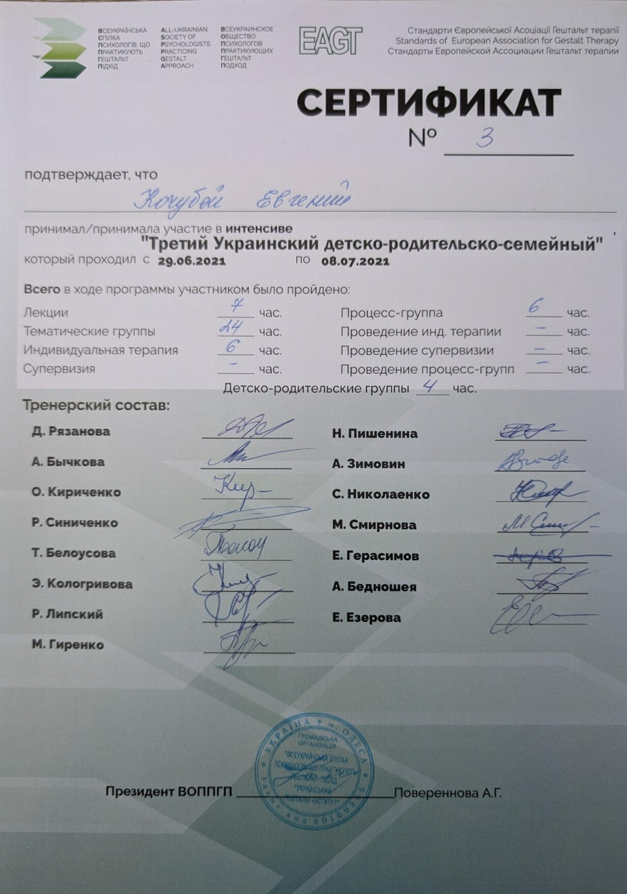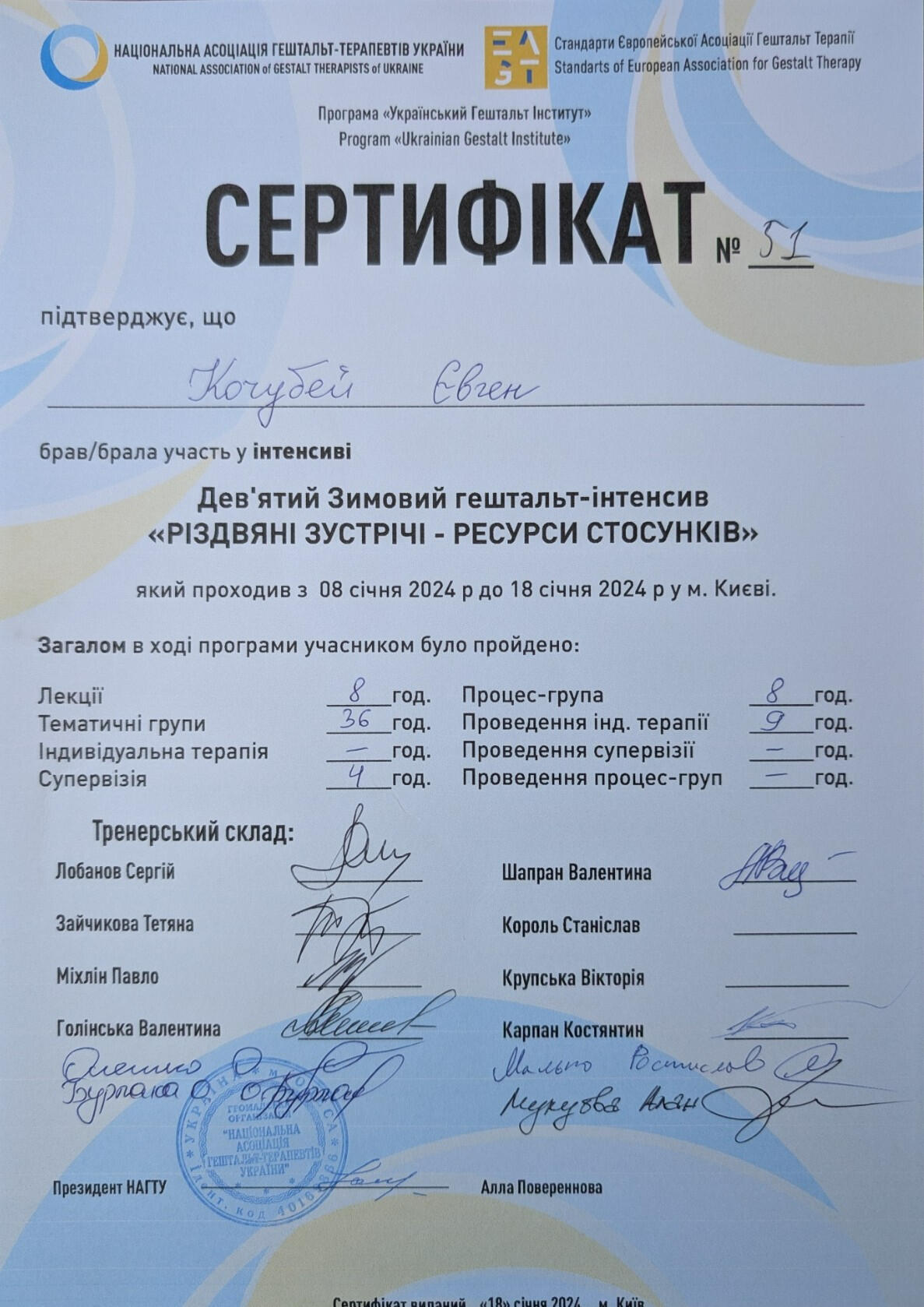 Гештальт-інтенсиви: участь у трьох програмах в ролі клієнта та терапевта.