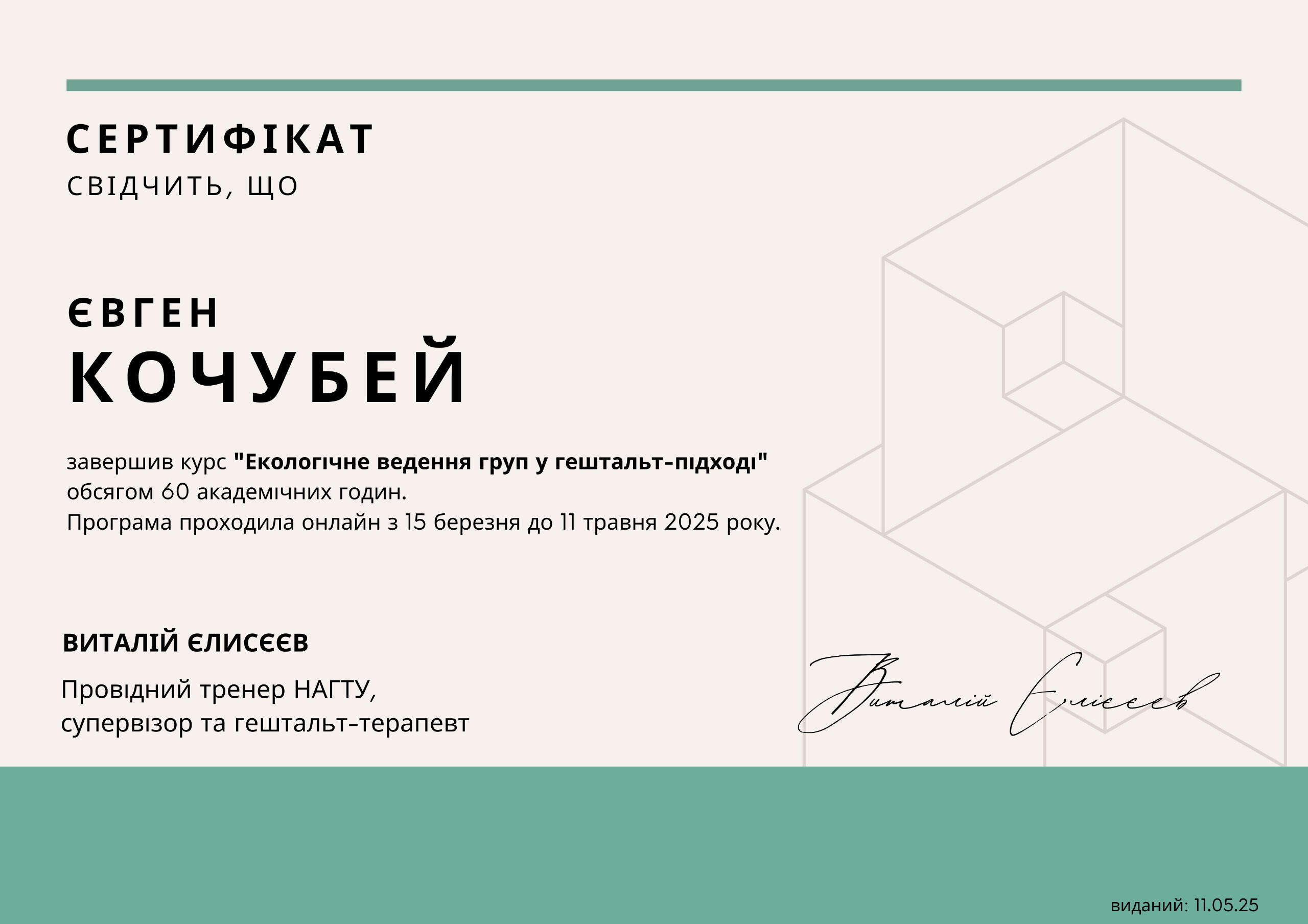 Євген Кочубей - клінічний психолог, гештальт терапевт у навчанні (сертифікація травень 2026), спеціалізація по роботі зі співзалежністю в гештальт підході, курс по екологічному веденню груп в гештальт підході.